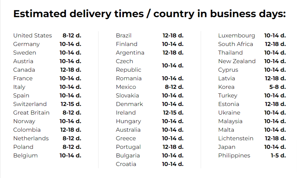 Det tager normalt 1-2 arbejdsdage at behandle din ordre. Derefter kan du forvente følgende leveringstider afhængigt af dit land: